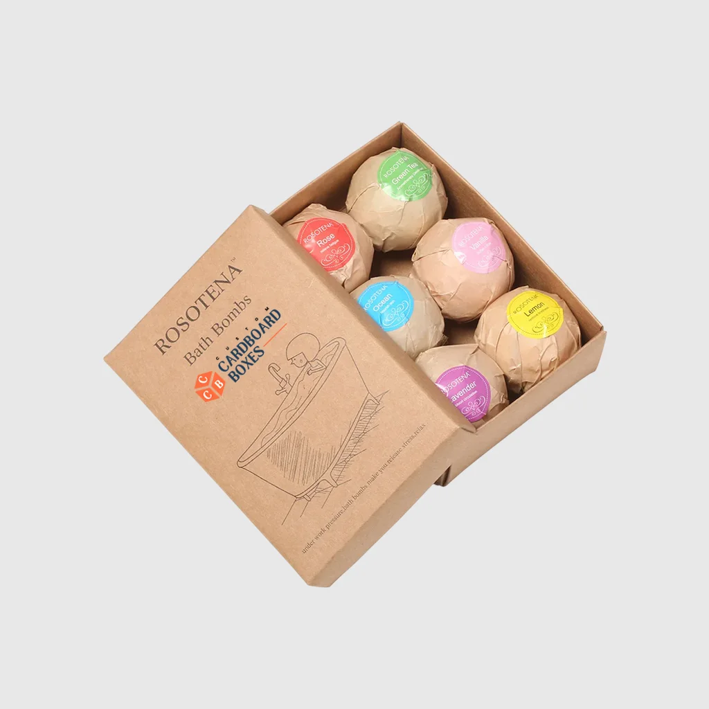 We use Kraft, white, rigid, and corrugated cardboard. Each material ensures durability, eco-friendliness, and excellent printing results while protecting bath bombs during retail display and shipping